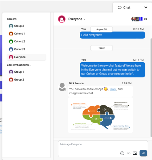 The class chat feature is a new way for learners to interact with each other and/or class instructors. With a new Chat button at the bottom of the screen, learners can quickly open the chat window from anywhere in the class and talk with everyone in the class, just their cohort, just their group, or any combination of those – depending on how you set it up.