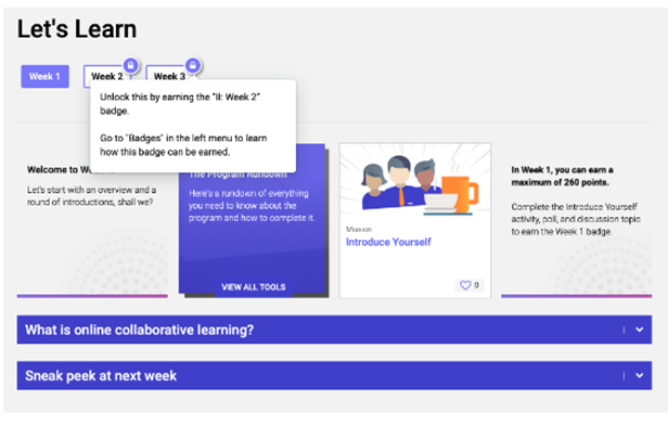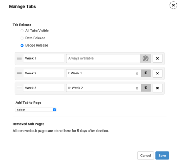 - Partial Preview Mode: Unreleased tabs will show with a lock icon, but the content within won’t open when a learner tries to click on it. Learners can hover over the lock to show the requirements needed to unlock the tab (release date or badge requirements).