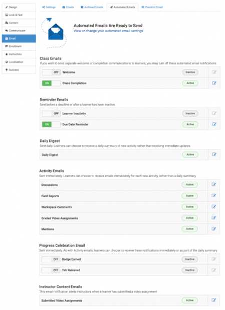 We also added new automated email types like Learner Inactivity and Project Due Date Reminders, as well as celebratory emails when a learner earns a new badge or new content is released.