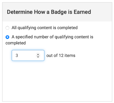 In the badge Qualifying Items tab, you’ll see a new “Determine How a Badge is Earned” box. From there you have two options: