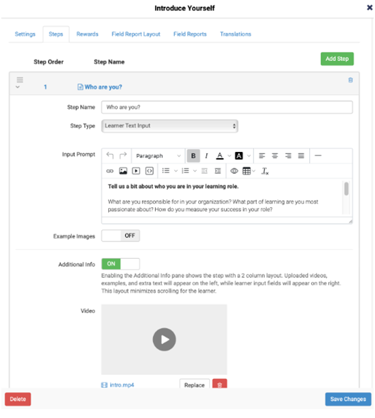 In addition to the existing YouTube/Vimeo options, we added the ability to upload videos into Mission steps. In your Mission steps, you will see a new “Additional Info” toggle that provides you the ability to upload a video and add any additional text or images you might need.