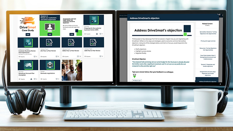 ServiceNow’s global onboarding experience helps new sales hires ramp up quickly by combining live sessions, case studies, and self-paced learning. Over six weeks, learners walk through a simulated three-year customer journey—practicing strategies for every stage, from prospecting to renewal.