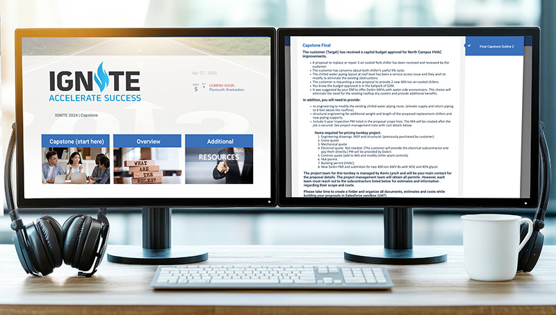 The final capstone simulates a real customer challenge, requiring participants to partner with actual Daikin engineers and subcontractors. Working in small teams, they collect real estimates, draft detailed proposals, and input scoped solutions directly into Salesforce.