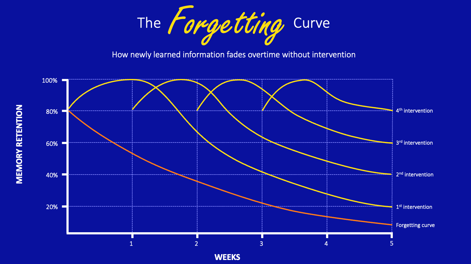 Memory formation thrives on repetition. The forgetting curve example shows that without reinforcement, most new information fades much too quickly to reach our long-term memory—sometimes within hours.