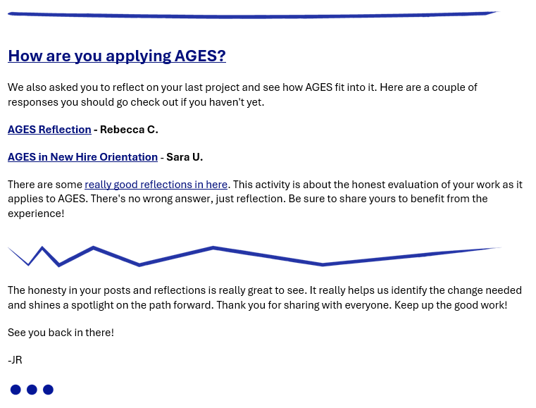 It can be a play-by-play highlight that recognizes great ideas being generated, challenges being solved, and collaboration that is happening. It can also be an “MVP” or super contributor award that garners a special mention.