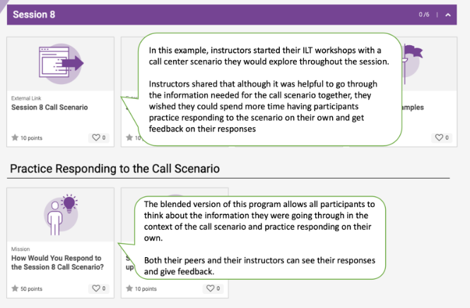 Are there challenges learners have faced during the ILT program? Consider how your blended learning program can address them. Perhaps learners are excited about what they’re learning during the ILT, for instance, but have a hard time using new skills or applying information in their longer-term everyday work. Provide activities in your blended learning program where they are asked to apply, share, and can see how other learners are using the same information.