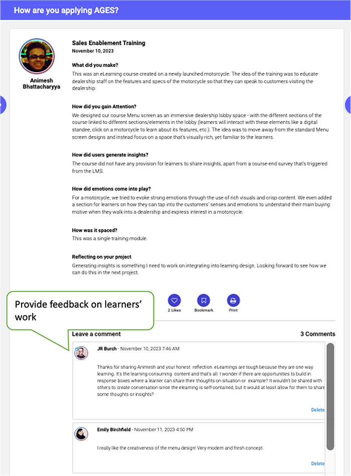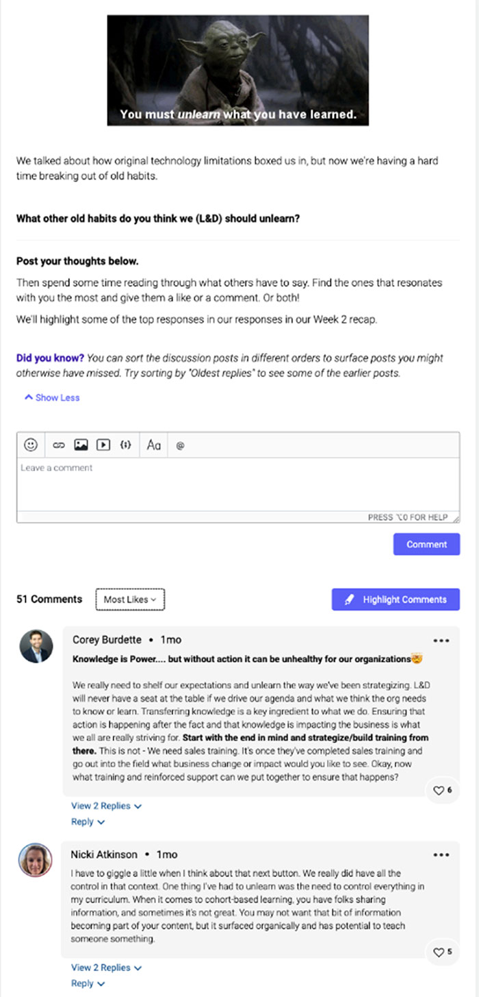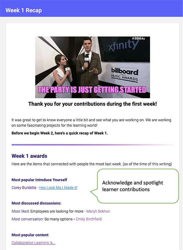 - Encourage and highlight learner contributions so they feel acknowledged and celebrated. Public recognition goes a long way in fostering a sense of community and motivating continued participation.