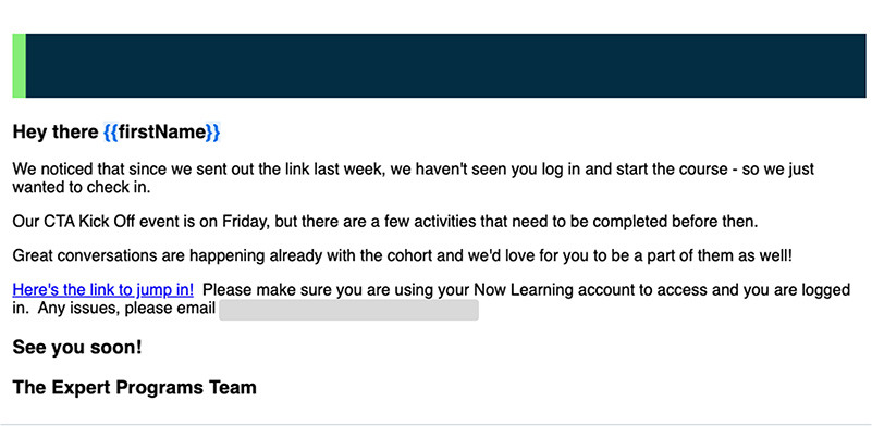 - Add gentle nudges when they’ve been inactive or need to complete an activity. A friendly reminder with a link into the program can rekindle their engagement.