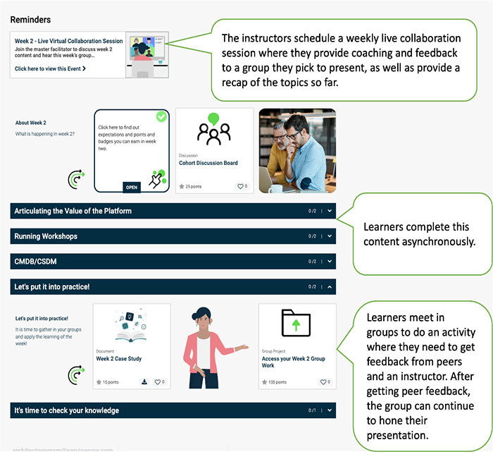 Are you breaking learners out into groups for activities during live sessions? Ask them to add that groupwork to the system where they’re going through content on their own, so they can refer to that activity, see others’ work on the same activity, and how it connects with subsequent material.