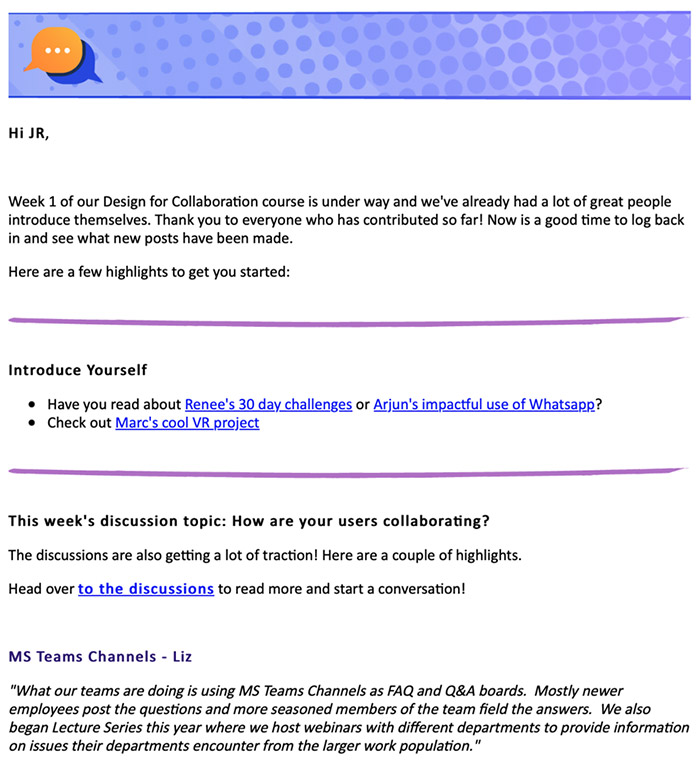 • Use a mid-week highlight email to showcase some of the best posts learners have shared so far (another gentle nudge)