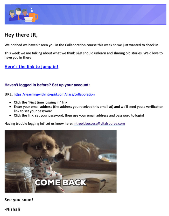 Gentle nudges entice the learner to click and log back into the class by sharing new, engaging information with them, such as letting them know new content has been released or sharing what other people are posting. Strong nudges add a little bit of accountability by letting the learner know we have noticed they haven’t logged in at all.