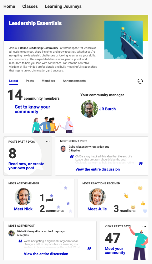 Communities can be tied to a class, but they can also stand alone! You may have topics you want to share or open up for discussion without needing a full program. Think of it like a LinkedIn group but within your learning environment.