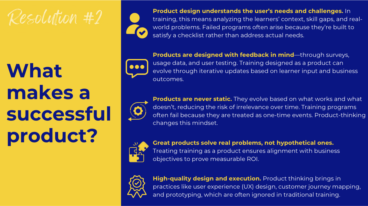 Products solve problems. They’re designed with care, iterated on, and provide value. So why not approach learning the same way? Build experiences that solve real problems, evolve with user feedback, and deliver measurable impact.