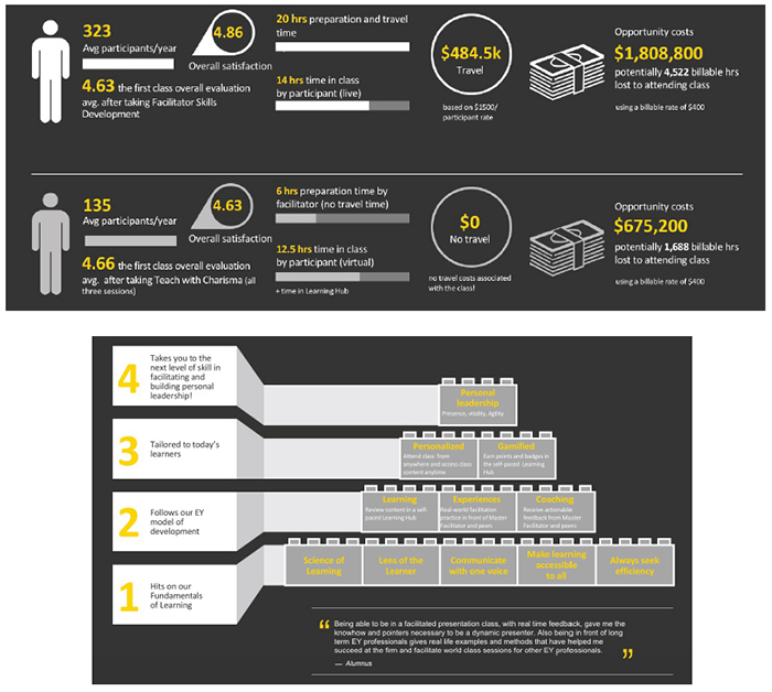 This global consulting firm has a strong culture of “reaching down the ladder”, and an unwritten rule that if you don’t teach and share your knowledge to help others, it will be harder to make partner. Their facilitator skills development course was traditionally the firm’s highest-rated and most popular course, one that participants loved dearly. It taught the basics of teaching to associates who would then go out into the employee population and lead classrooms of their own.