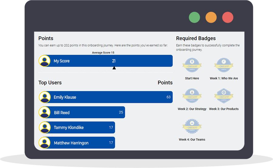Learners have access to a personal leaderboard summarizing points and badges earned.Assessments