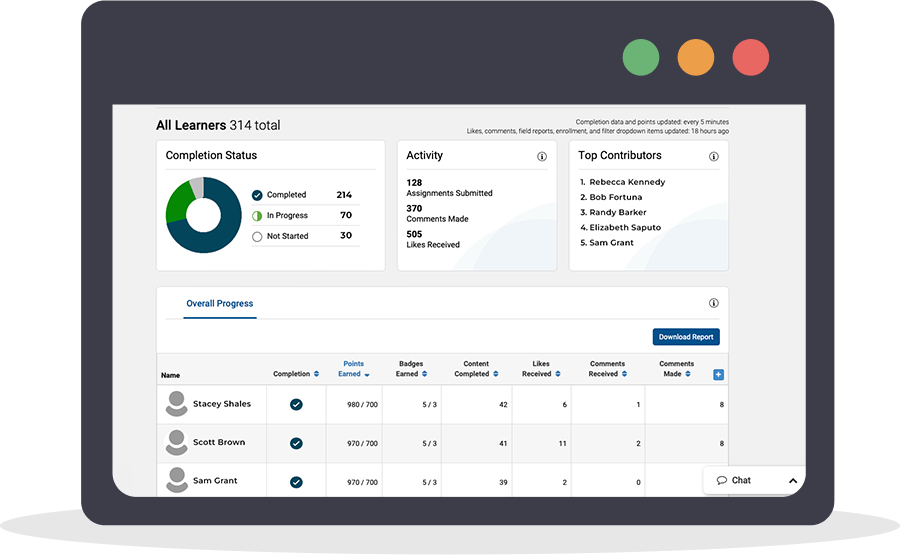 Learners can ask questions, post comments, and get feedback from fellow learners and program facilitators.Live Chat